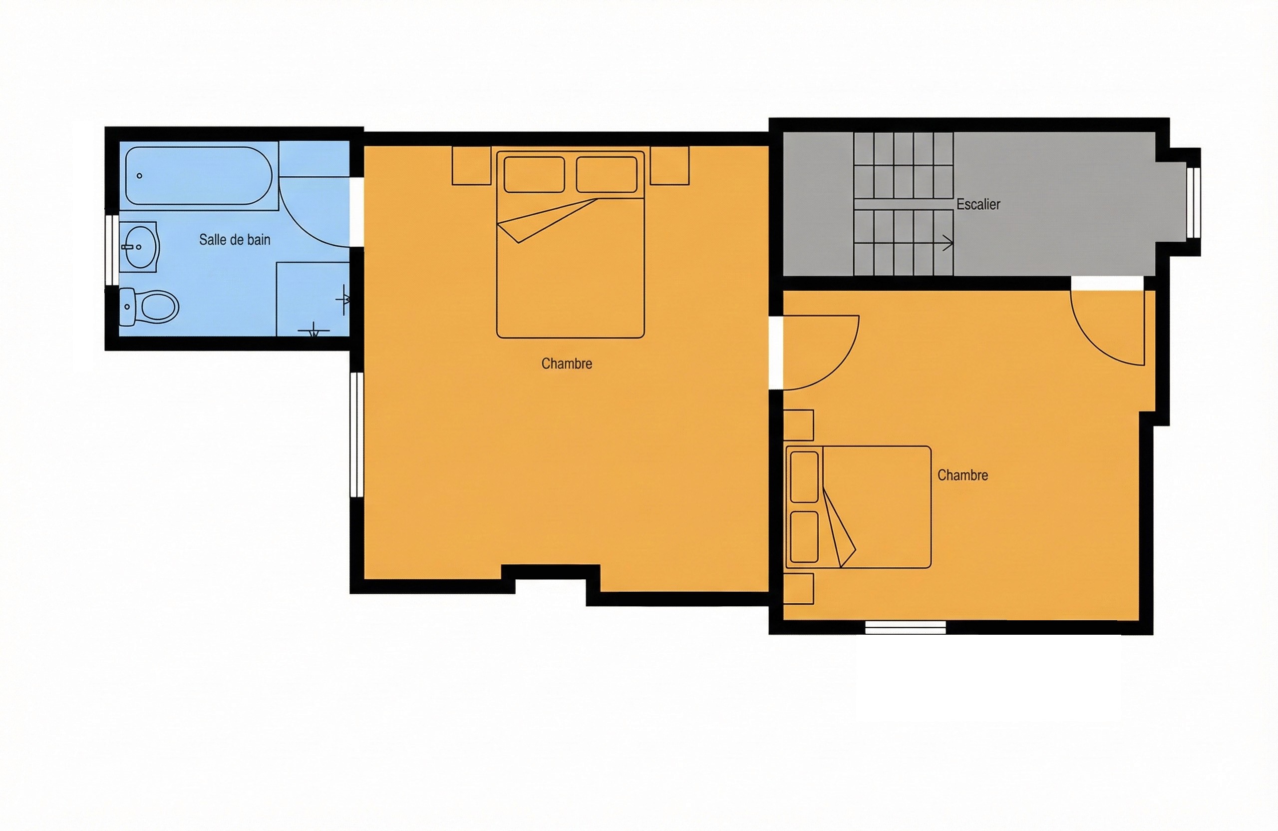 Espace nuit à l'étage : Deux grandes chambres confortables (14 m² et 20 m²) et une salle de bain avec baignoire.