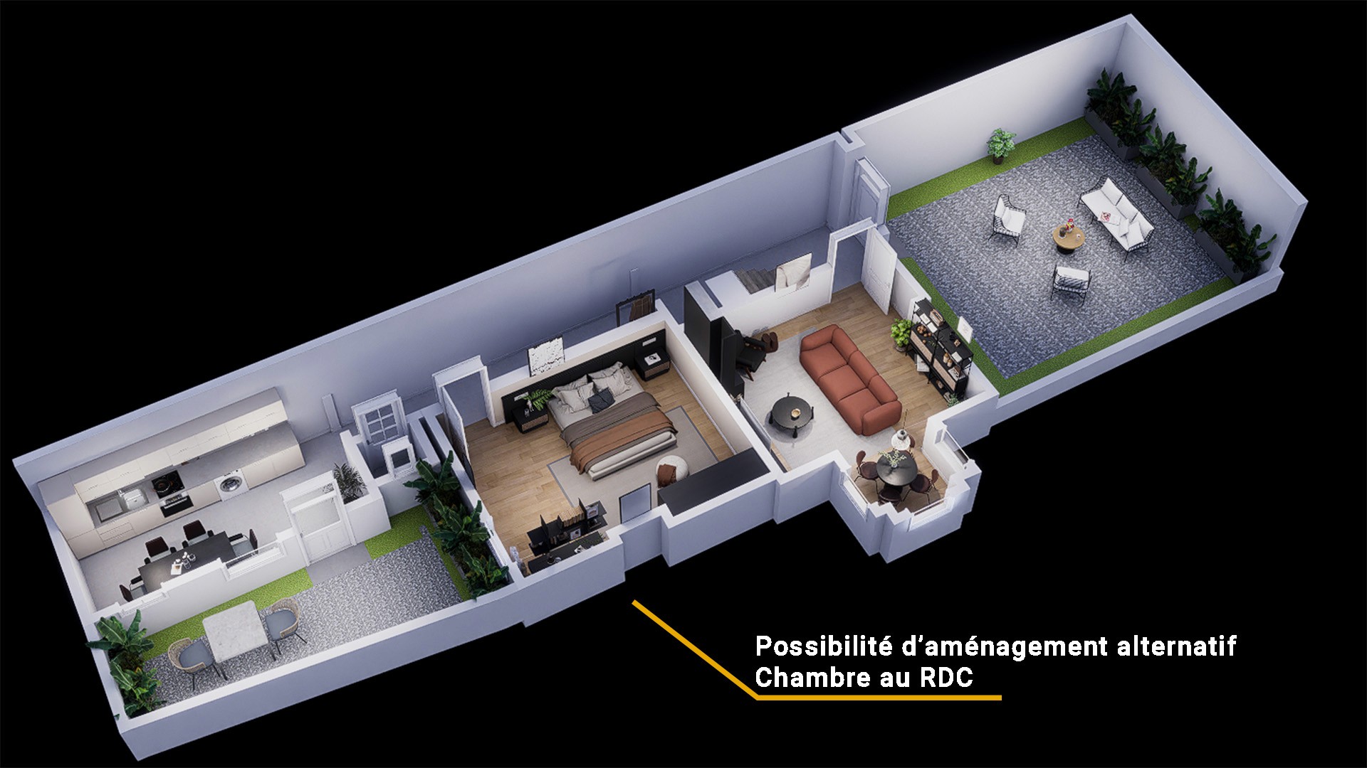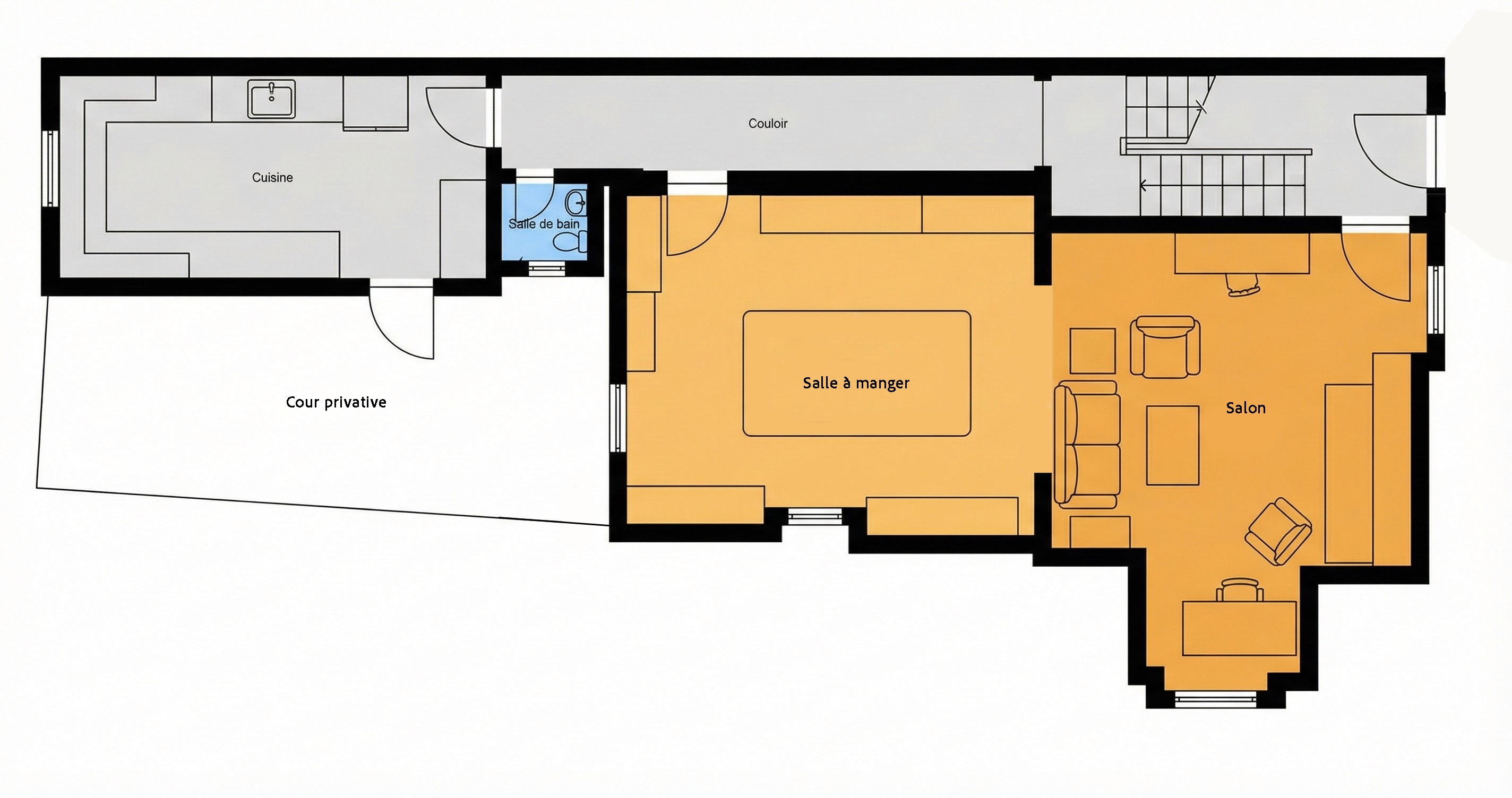 Rez-de-chaussée traversant : Un vaste séjour de 30 m² et une cuisine semi-équipée s’ouvrant directement sur votre cour (patio) privative. Imaginez vos petits-déjeuners au calme, à l’abri des regards.